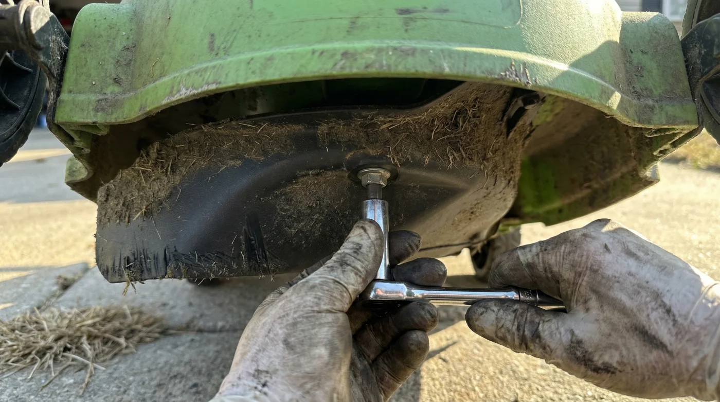 To perform this quick physical modification, you only need a basic socket wrench. First, ensure the battery is entirely removed from the mower, as physical safety always comes first when working near sharp edges. Tip the mower securely on its side to expose the plastic underbelly. Locate that curved black plastic wall sitting stubbornly near the rear discharge chute.