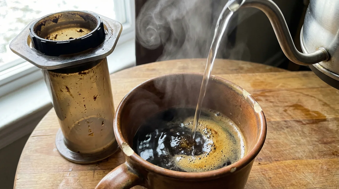 You now have a heavy, almost syrupy shot of espresso-like concentrate resting at the bottom of your mug. Now comes the defining step: the bypass. Take your kettle and pour clean, hot water directly into the mug to dilute the concentrate to your preferred drinking volume. Because this bypass water never touches the exhausted coffee grounds, it carries absolutely no tannins or bitter compounds. You are simply lengthening the perfect sweet extraction.