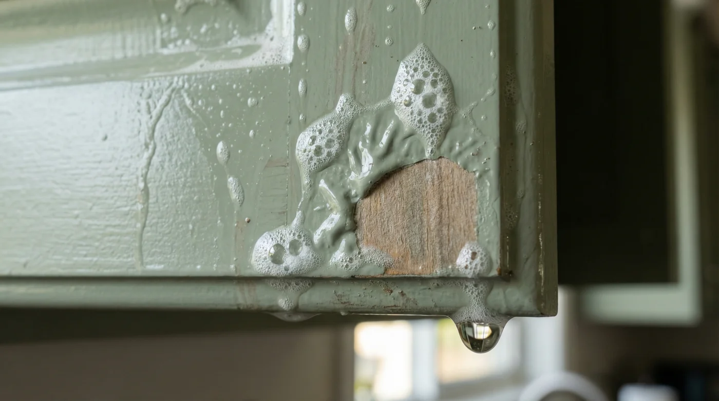 To understand exactly what happens at a microscopic level, I spent a rainy afternoon with Marcus, a custom cabinet builder and restorer based just outside of Vancouver. His shop smelled pleasantly of fresh pine and natural linseed oil, a stark contrast to harsh chemical cleaners. He stood near his workbench, wiping fine sawdust from his apron, before running a calloused thumb over a gummy, clouded patch on a beautiful navy-blue shaker door. ‘People bring these ruined doors to me in an absolute panic,’ he muttered, pointing to the sticky residue where the premium paint had actually softened into a thick paste. ‘They leave the spray on the wood while they empty the dishwasher or answer an email. Past three minutes at normal room temperature—around 21 Celsius—the alcohol completely penetrates the clear coat. By the time you come back to wipe it with a sponge, you are literally peeling off the protective finish right down to the bare primer. Replacing or colour-matching a single custom door can cost hundreds of dollars, all because of a three-minute mistake.’