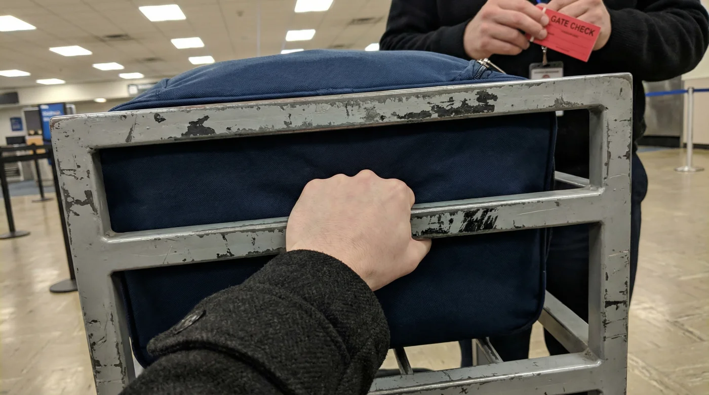 A bulging front pocket is the most common reason a perfectly legal bag fails the gate test. Keep your laptops and liquids in the main compartment until you pass the checkpoint. Do not rely on expandable zippers under any circumstances.